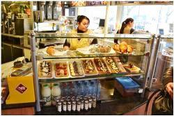 入口では店員さんがワッフルを焼いており、甘い香りが漂っています。テイクアウトも可能ですが、ゆっくりされたい方は店内で食べてみてください。常に混んでいますが、2階席は広いので利用して見てください。テーブル席へは店員さんが案内してくれます。