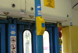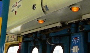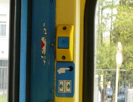 降りるときは、1つ手前の停留所を過ぎたら青か黒のボタンを押します。押したボタンのすぐ近くの扉の上のランプが灯り、扉が開きます。近くの扉が開かない時は自分でボタンを押して開けましょう。